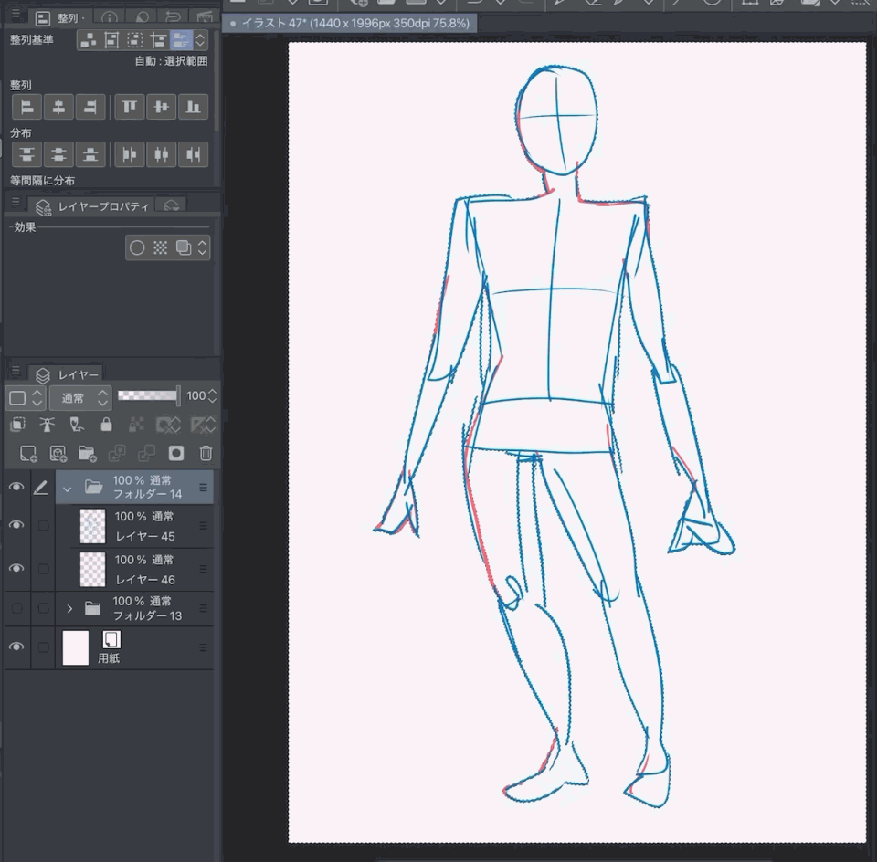 Wenn Sie Posen-Entwürfe zeichnen, kann der gesamte Fluss manchmal steif wirken. Indem Sie nicht bewegte Teile wie Füße oder den Kopf mit Pins fixieren und den Körpermittelpunkt so anpassen, dass er flüssiger aussieht, oder Verzerrungen bei der Ausrichtung von Gesicht und Körper korrigieren, können sich auch Bereiche außerhalb der direkten Korrektur leicht verschieben. Dies kann zu einer Geschmeidigkeit führen, die Sie beim Zeichnen ursprünglich nicht beabsichtigt hatten.