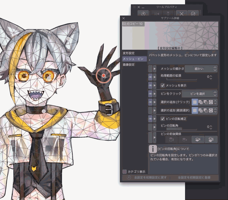 Unter „Werkzeugeigenschaften“ → „Sub-Tool-Details“ → „Gitter/Pins“ können Sie anpassen, wie fein das Gitter unterteilt wird, um den Verformungsbereich zu präzisieren. Bei Pins können Sie auch die Pin-Rotation und die Überlappungsreihenfolge bestimmen, d.h. ob das umgebende Bild bei überlappenden Pins in den Vordergrund oder Hintergrund rückt.