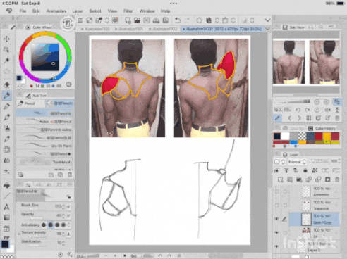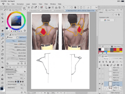 Orientierungspunkt 3: Für das Schulterblatt wird eine quadratische Linie gezeichnet; eine runde Form, die die Teres-Struktur am unteren Ende des Schulterblatts darstellt, wird ebenfalls gezeichnet.
