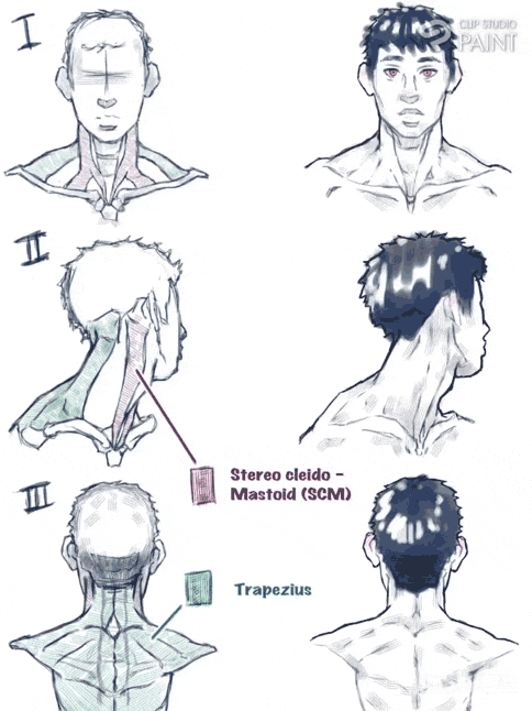 Der Winkel, in dem der Kopf geneigt ist, und die Körperhaltung des Charakters können das Erscheinungsbild von Hals und Schultern dramatisch verändern. Zum Beispiel kann eine nach vorne geneigte Haltung die Halsmuskeln (sowohl den Musculus sternocleidomastoideus SCM als auch den Trapezmuskel) verlängern und vieles mehr.
