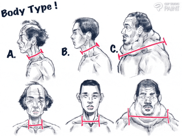 Die Länge des Halses und der Schultern kann je nach individuellem Körperbau, ob es sich um einen muskulösen oder normalen Charakter handelt, variieren und auch durch die künstlerischen Stilentscheidungen verschiedener Künstler beeinflusst werden.