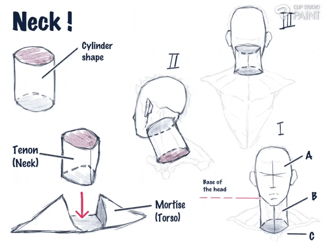 Der Hals ist eine zylinderartige Form, die den Kopf mit dem Torso verbindet, wobei die Schädelbasis oben anschließt.