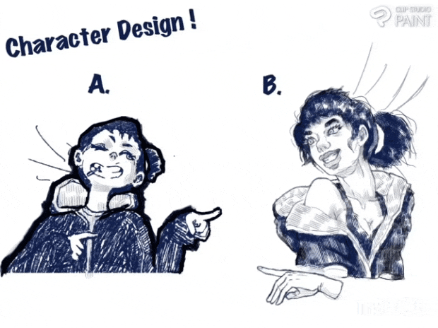 Der Stil des Charakters (cartoonhaft [A.] vs. stilisiert [B.]) kann beeinflussen, wie übertrieben oder minimiert die Dimensionen von Hals und Schultern erscheinen.