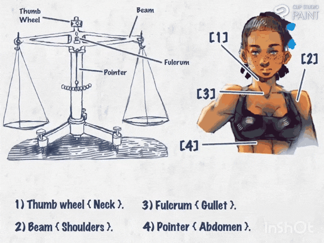 Visualisiere Hals und Schultern deiner Charaktere als Teil einer Gewichtswaage. Der Hals stützt deinen Kopf (der auf der Waage als Daumen dargestellt werden kann), während die Schultern die Handbewegungen steuern (als Balken dargestellt werden können). Der Torso (dargestellt als Zeiger) zeigt das gesamte Körpergleichgewicht.