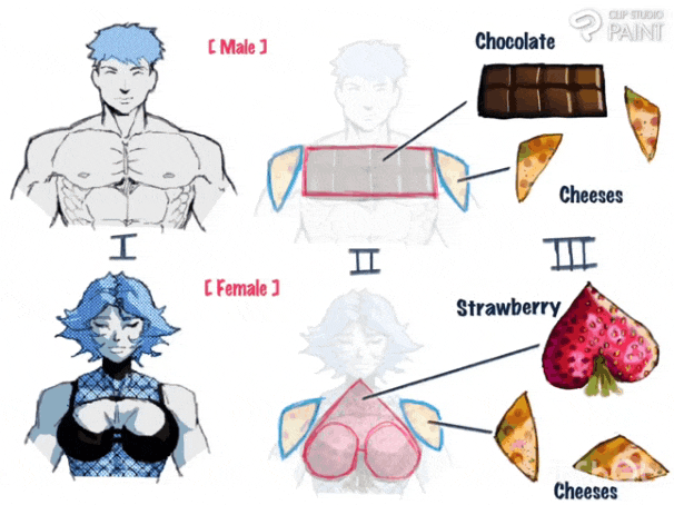 Visualisiere die Bruststruktur als eine feste Masse, wobei Männer sie als quadratische Form und Frauen als umgedrehte Herzform sehen. Die Schultern treten hervor, stellen hausgemachten Stinkekäse dar, heften sich an beide Enden des Brustkorbs und schaffen Volumen und Erdung.