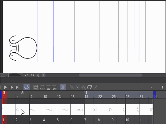 Das Zwischenbild wurde einfach mit der Zwiebelschalenfunktion (Onion Skin) in CSP erstellt. Um sie zu aktivieren, gehe ich einfach zum Animationsmenü>Animations-Cels anzeigen>Zwiebelschale aktivieren. Oder ich klicke einfach auf das Zwiebelschale aktivieren-Symbol in der Zeitleiste-Palette.