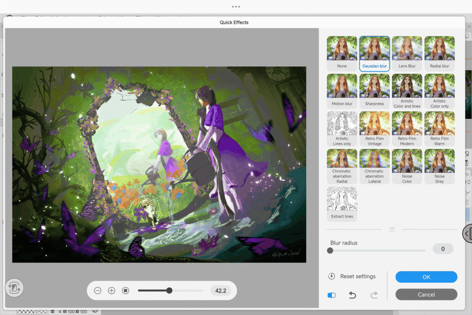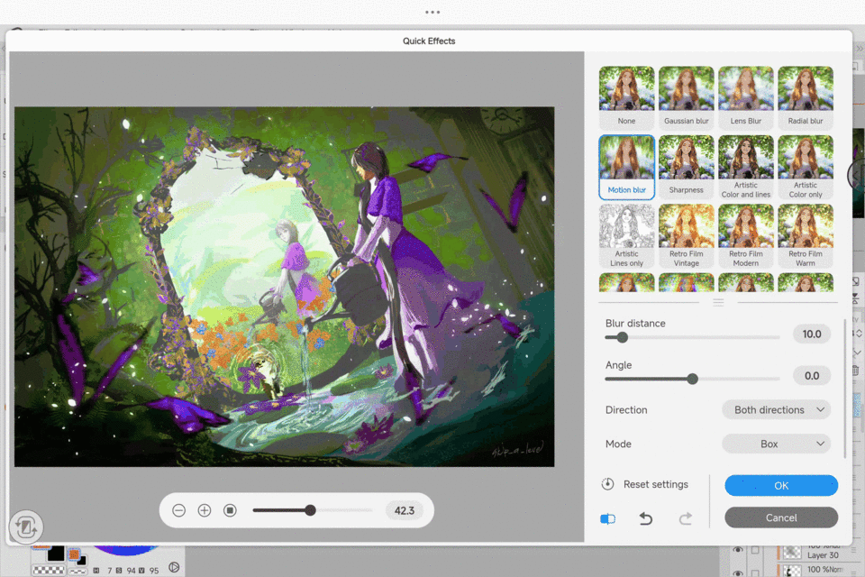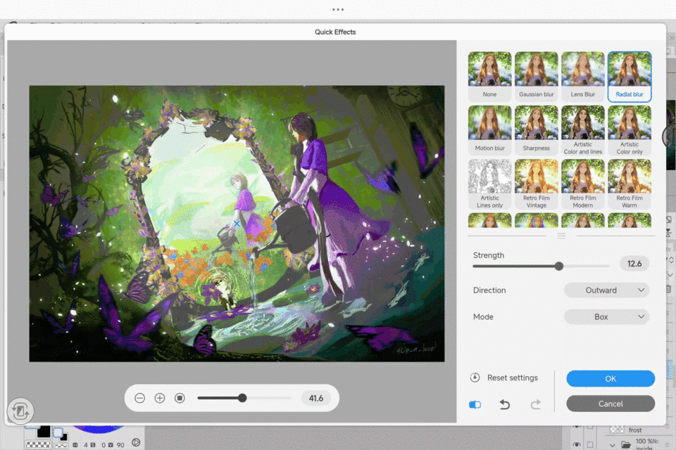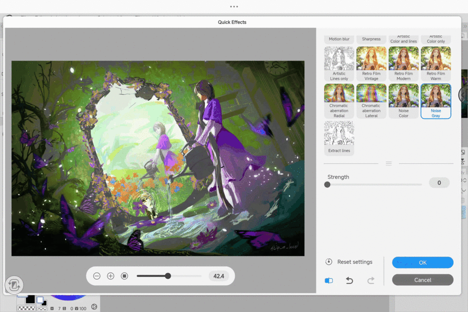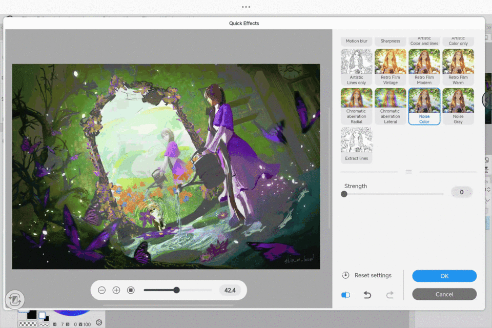 Der Zugriff auf schnelle Effekte funktioniert genauso wie bei den Schnellfiltern. Sobald Sie die ersten Schritte befolgt und das Bedienfeld geöffnet haben, sehen Sie eine größere Auswahl an Effekten, die Sie anwenden können. Im Gegensatz zu Schnellfiltern sind diese jedoch nicht dazu gedacht, Farbe oder Ton zu ändern. Anstatt Farben anzupassen, ändern schnelle Effekte die visuelle Darstellung Ihres Kunstwerks, indem sie Dinge wie Unschärfe, Bewegung, Textur, Glanz oder Verzerrungen im Kamerastil hinzufügen.