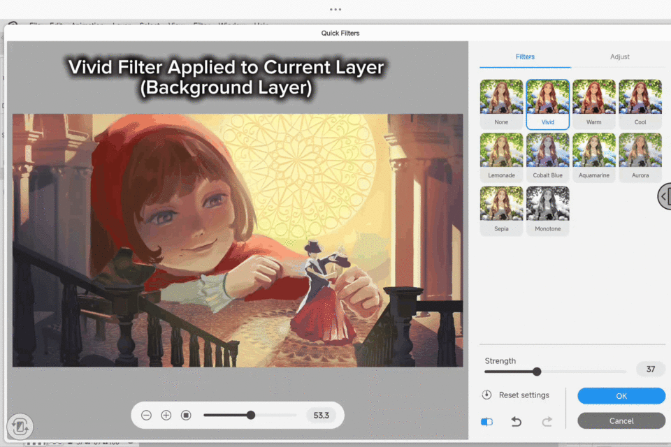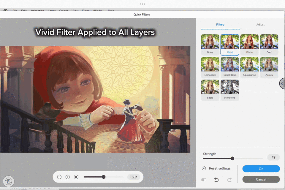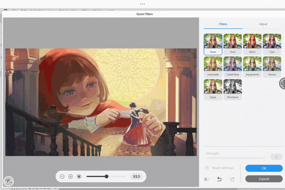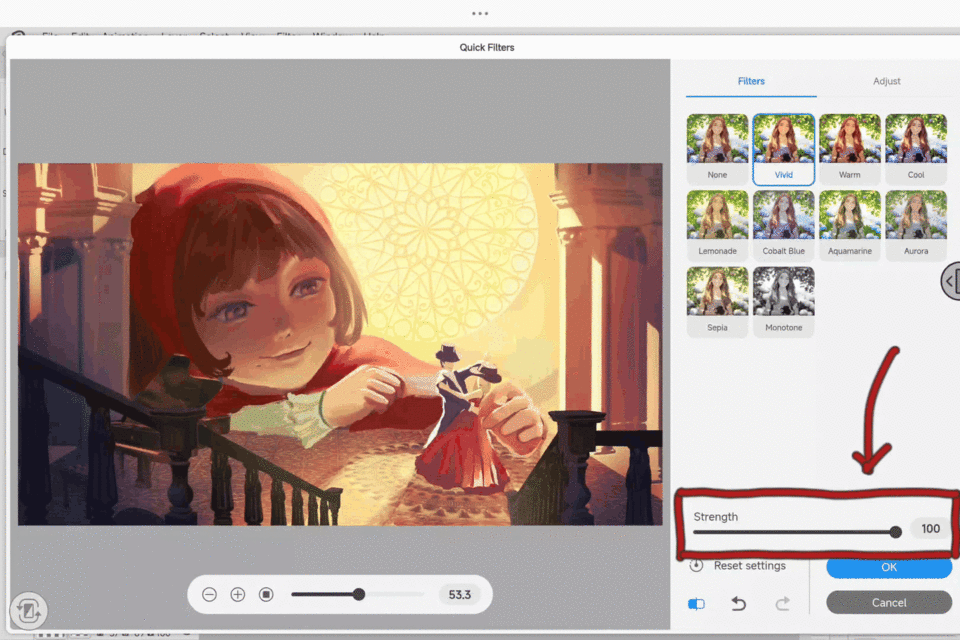 Wenn der Filter zu stark oder stumpf aussieht, keine Sorge, es gibt einen Schieberegler, um die Intensität des Effekts zu steuern.