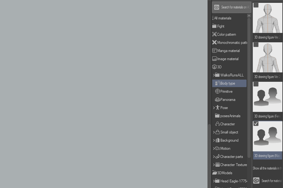 Es gibt vier Hauptkörpertypen im Materialfenster von Clip Studio. Diese Materialien finden Sie unter Fenster/Material/Material[Körpertyp]. Diese Körpertypen sind kostenlos; es gibt zwei alte Modelle (weiblich, männlich) mit menschlichen Proportionen und zwei neue mit Anime-Proportionen. Diese sind sehr vielseitig, da sie die Körperteile in jede menschliche Pose bewegen und die Proportionen anpassen können, um einen Charakter an Ihre eigenen Bedürfnisse anzupassen.