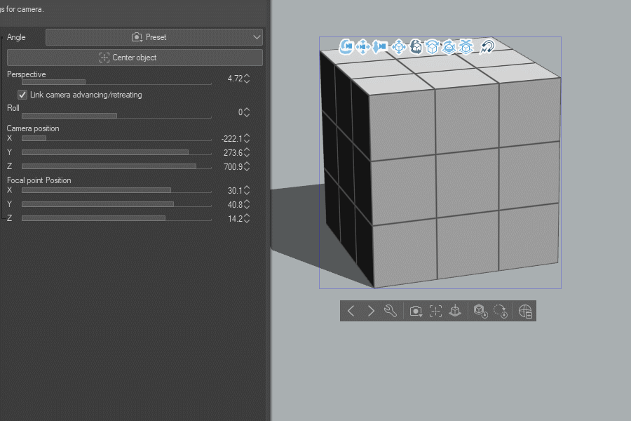 Lassen Sie uns eine neue 3D-Ebene erstellen. Dies kann unter Ebene/Neue Ebene/3D-Ebene erfolgen. Das Wichtigste, was wir hier sehen können, ist die Kamera (um die Einstellungen zu ändern, gehen Sie zum Schraubenschlüssel-Symbol (S3) unter Zuweisen/Kamera/Perspektive). Sie können die Brennweite ändern, um die Emotion der in Filmen verwendeten Festbrennweiten zu erzeugen. Clip Studio verwendet keine 35-mm-Sensor-äquivalenten FL-Objektive, sondern eine Zahl zwischen 1 und 100, genannt Perspektive... Es ist so lustig, ich habe dies geschrieben und es hat 4 Stunden gedauert, aber ich verstehe endlich, wie die Perspektive für die Kamera im 35-mm-Äquivalent funktioniert. Um die Brennweite (FL) in das Perspektiv-Äquivalent in Clip umzuwandeln, müssen Sie 236 durch die Brennweite teilen. Um beispielsweise die äquivalente 28-mm-Objektivperspektive zu ermitteln, die in Clip verwendet werden soll, führen Sie einfach diese Operation durch: 236/28 = 6.74. Da die Perspektivwerte in Clip von 1 bis 100 reichen, beträgt die maximale Brennweite 236 mm und das Minimum 2,36 mm Äquivalent.