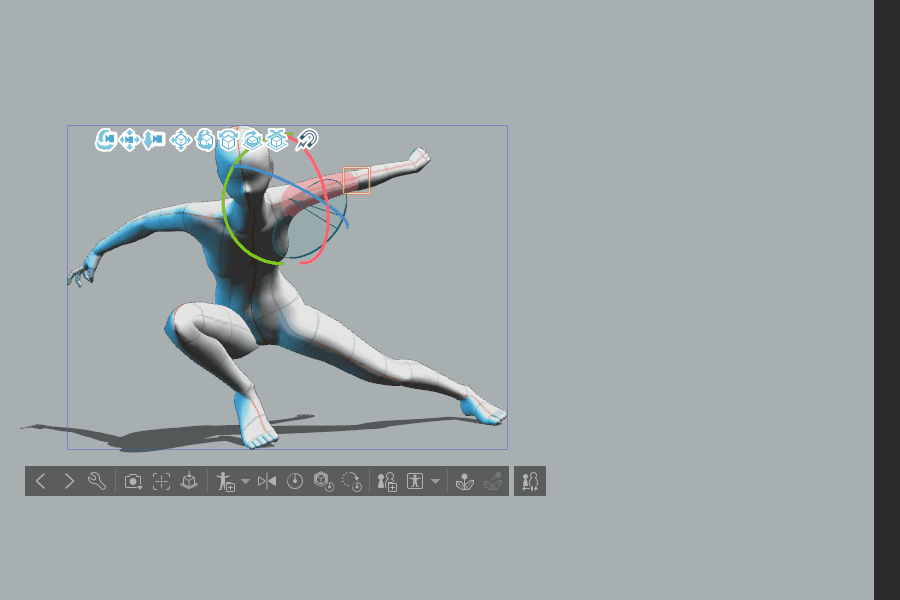 Alle IK-Manipulatoren ermöglichen es Ihnen, den entsprechenden Körperteil zu bewegen und zu drehen, aber der Manipulator für Hände und Füße ermöglicht spezielle Bewegungen, die ich erklären möchte. Wenn Sie den Manipulator für eines der Gliedmaßen drücken, können Sie dieses Extremität normalerweise bewegen, aber ein weiteres Rotationsrad erscheint, das es Ihnen ermöglicht, den entsprechenden Ellbogen oder Knie zu bewegen, um den Charakter in die gewünschte Position zu bringen. Wenn Sie die perfekte Pose erstellen möchten, ohne die Kameraposition zu ändern, können Sie die Ansicht Alle Seiten verwenden (gehen Sie zu Fenster/Alle Seitenansicht), aber dies ist exklusiv für die EX-Version. Wenn Sie also PRO verwenden, müssen Sie die Pose umkreisen, um dasselbe Ergebnis zu erzielen, und eine andere Ebene mit der Kamera verwenden, die auf die perfekte Kamerakomposition eingestellt ist, dann können Sie den Charakter in der richtigen Pose kopieren und einfügen.