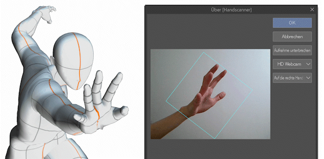 Ab Ver. 2.0 wurde ein [Handscanner] hinzugefügt, mit dem man die Hände einer 3D-Zeichenfigur in Pose bringen kann, indem man Handbewegungen filmt.