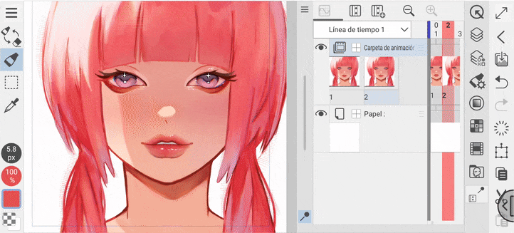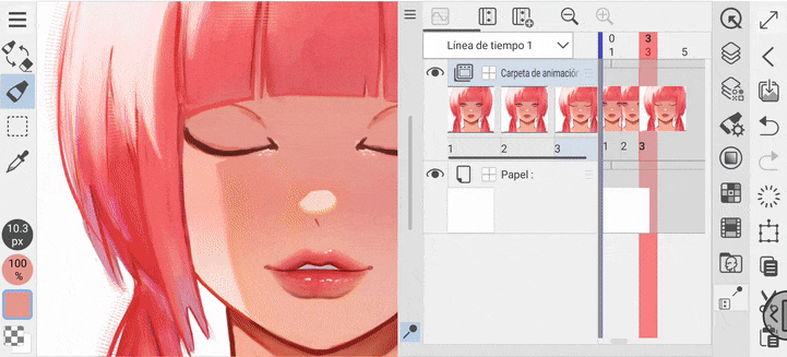For this third frame, we will repeat steps. This time, we will duplicate the layer we duplicated in the previous step, but in this case, we will not move the eyelashes; instead, we will paint the shape of completely closed eyes over the base eyes.