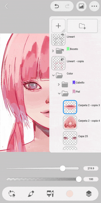 To do this, the first thing I do is put all the layers and folders I created for painting the skin inside another folder which I name with the original name «All», then I will create another folder inside «All» that is above the color (in this case, above the blending mode layers and the line art) which I name «Details», and it is inside this folder where I will generate layers to clean up the drawing.