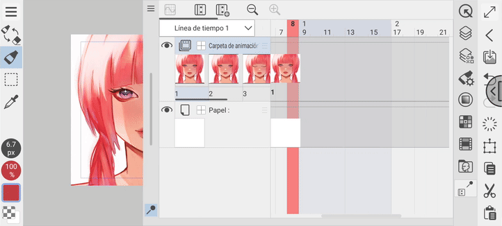 Playing the animation, I noticed a very large gap between blinks. To reduce this gap, I will cut the number of frames, reducing them from 24 to 15. To do this, go to the end of the 24 frames where you will find the separator that marks the frame limit (blue strip); you need to long-press it and drag it to the desired frame.