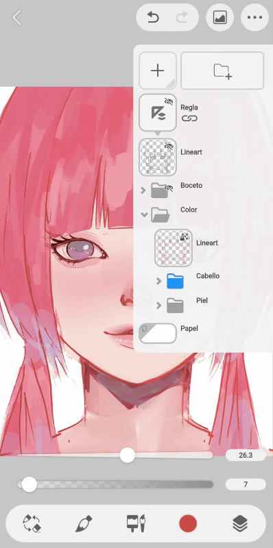 We cannot use the ruler to mirror all elements because this will create an unnatural effect, which is why it must be deactivated in some areas to paint them individually. To deactivate or delete the ruler, you must long-press the icon found in the layer thumbnail and select the corresponding option in the menu.
