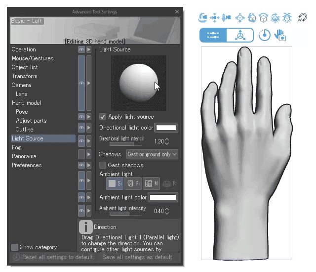 If you want to change the direction of the light, you can change the light settings for the 3D hand model from Light Source in the Advanced Tool Settings palette (or Tool Settings palette).