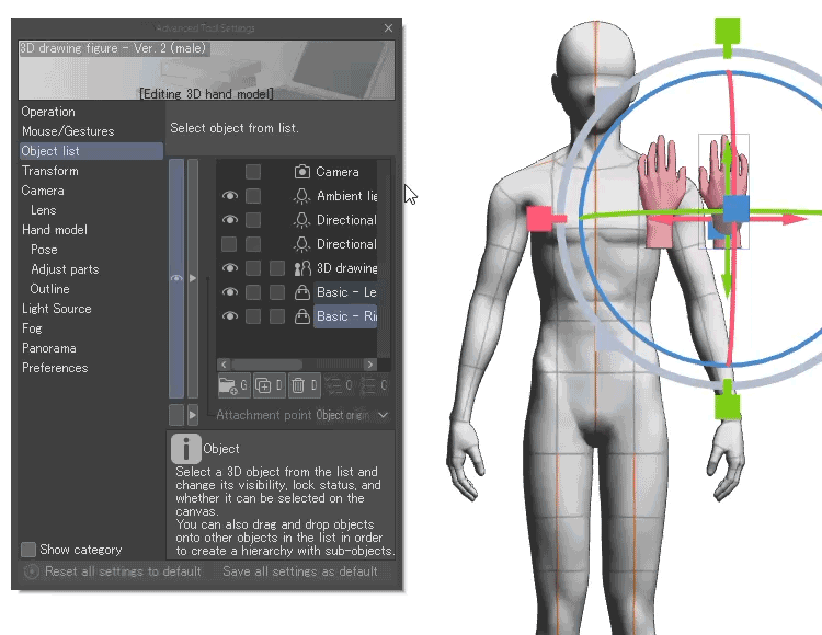Open Object list in the Advanced Tool Settings palette and drag and drop the 3D hand model onto the 3D drawing figure to set a parent-child relationship so they move together as one.