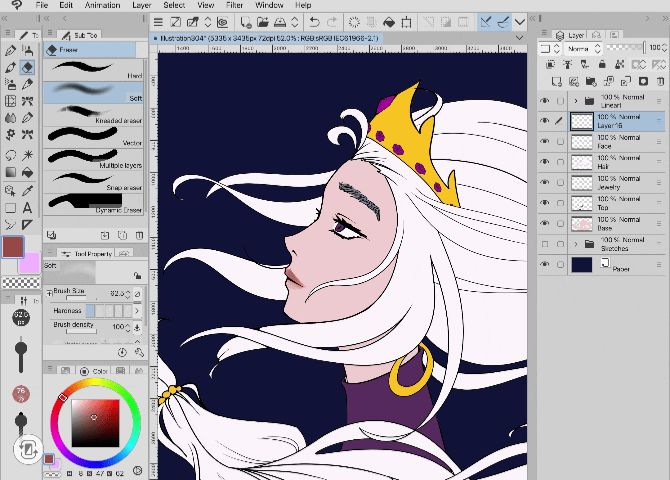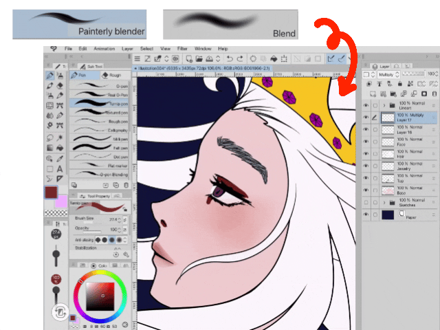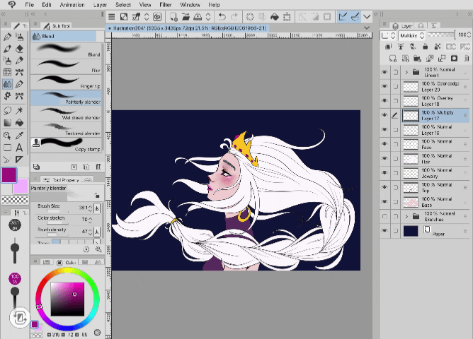 For the hair, I used 2 multiply layers, the first one was for the overall base shadows, and the 2nd was to add depth and emphasize where the hair clumps and meets.