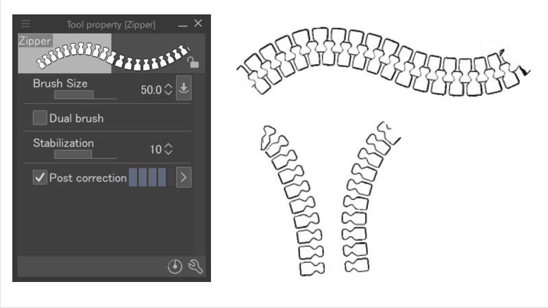 Note: By disabling [Dual brush] in [Tool properties], you can draw one side of the zipper (rather than a closed zipper).