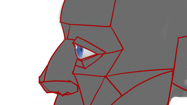Adding in the skin around the eye, we have the tear duct. The shape of the tear duct tends to change based on the character's ethnicity. However, a good rule of thumb is to make it shaped similar to a smoothed edge triangle.