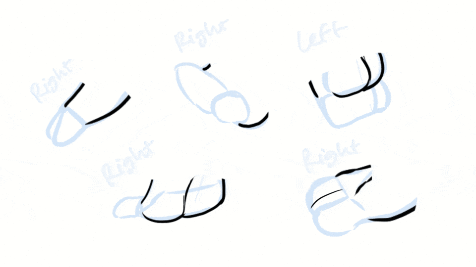 When drawing a foot, I like to simplify it using a triangle and draw the toe direction if needed. Then, draw the geometric shapes with the sole sketched even in angles where the sole isn't visible.