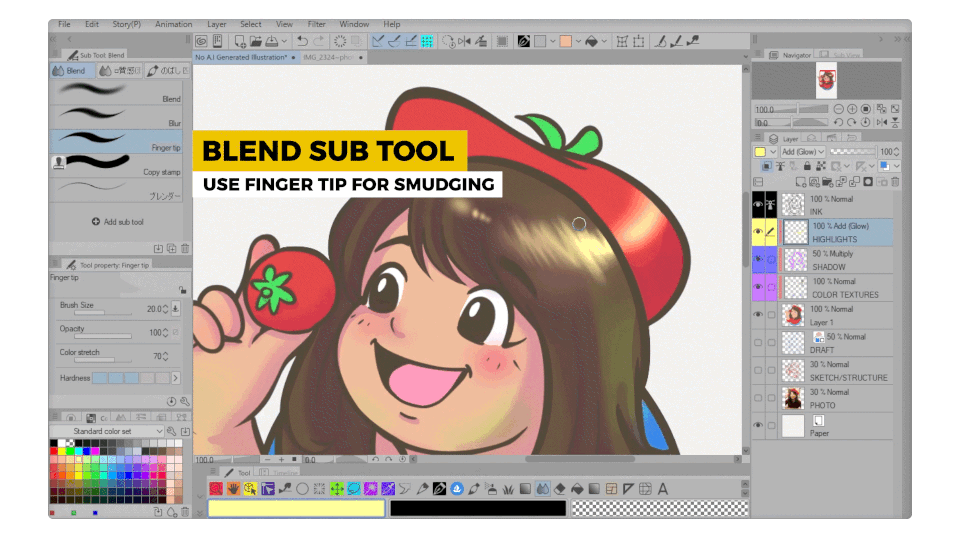 Versatile tool! As you see the GIF above, using FINGER TIP from Blend Sub Tool would be the perfect and effective tool for showing the hair strokes instead of just brushing it over and over with any brushes you had in mind.