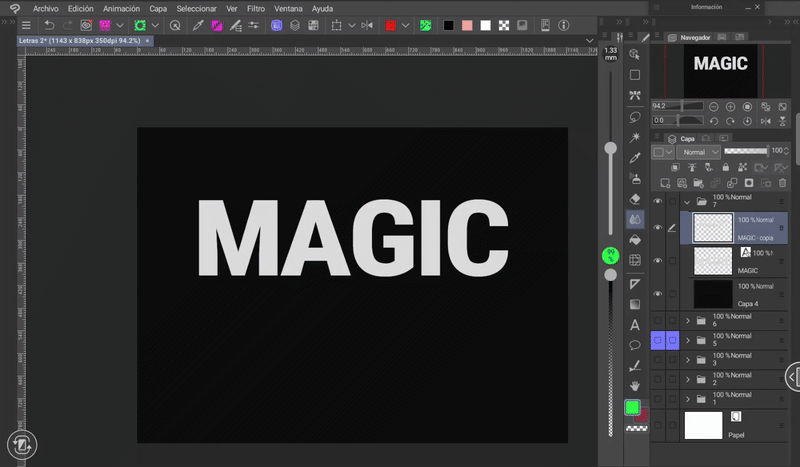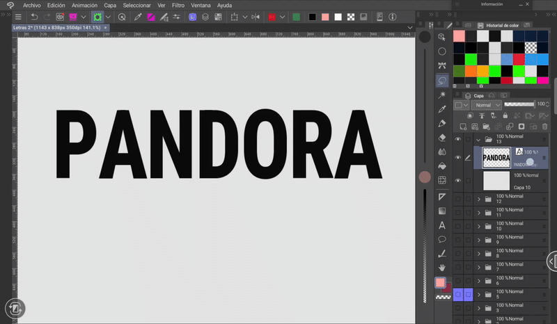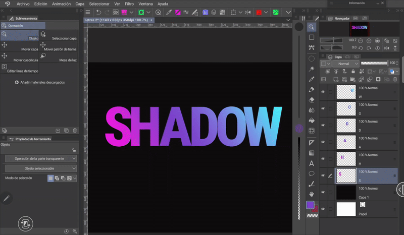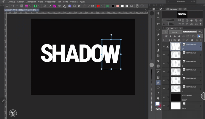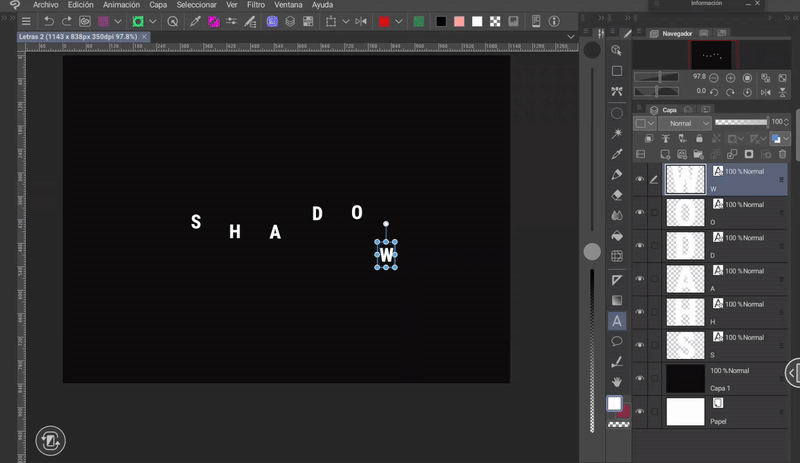 ➀ El primer paso para realizar este estilo de tipografía es usar la herramienta de «Texto», con ella hay que agregar letra por letra en una capa cada una.