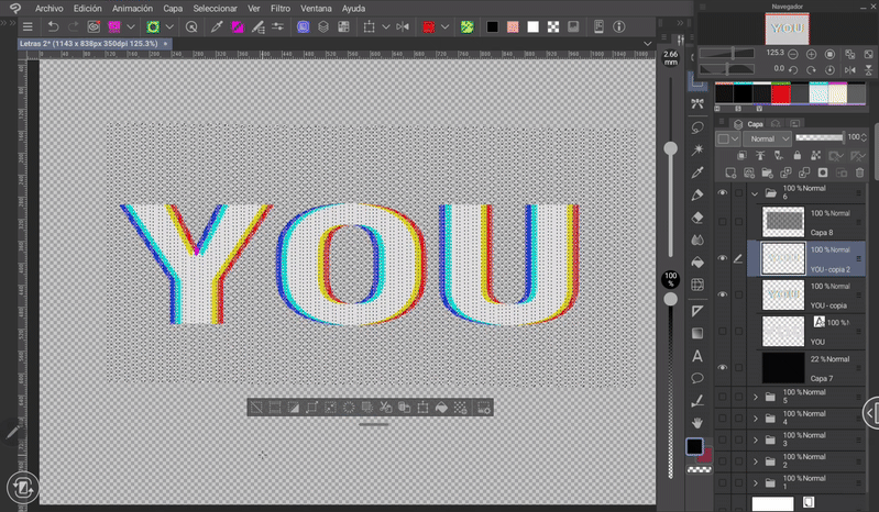 ➅ Duplicaremos la capa de las letras seccionadas que quedara después de los pasos anteriores y con la herramienta «Transformar» moveremos la capa a una posición que nos parezca apropiada. Listo, hemos terminado.