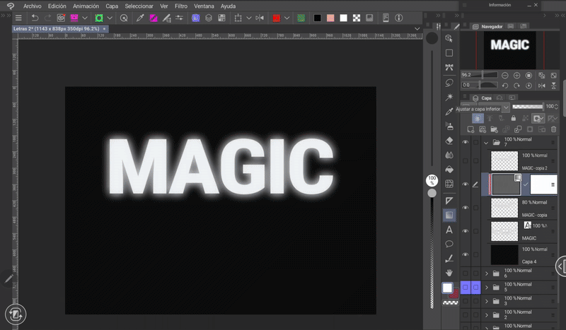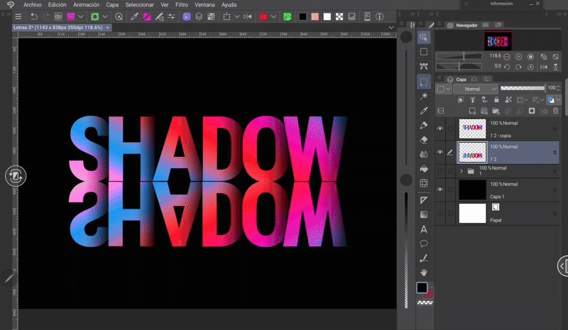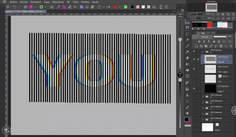 ➈ Por último, hay que duplicar esta capa de degradado por cada letra y colocarlas por encima de las mismas.