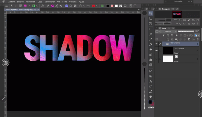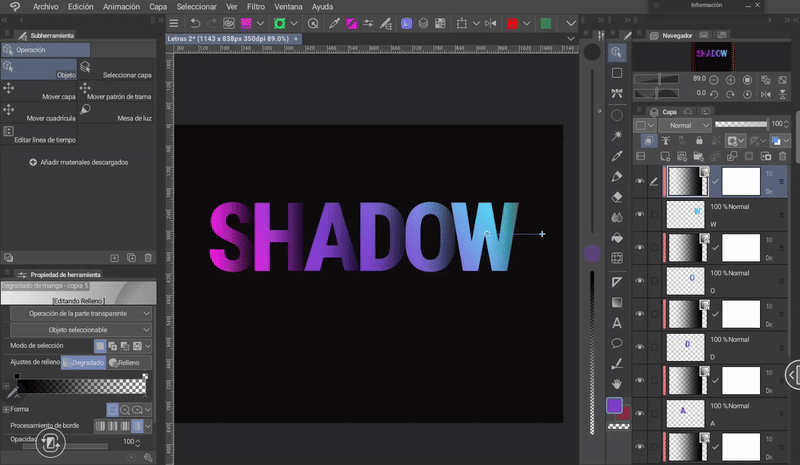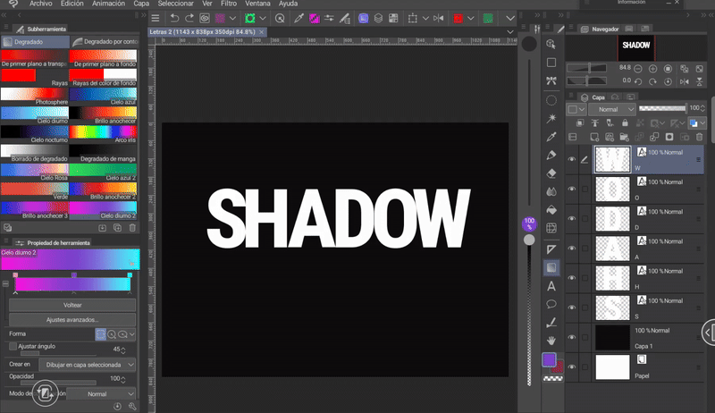 ➇ Ahora hay que aplicar el degradado de derecha a izquierda una letra a la vez sin cubrir toda la letra. Este degradado le otorgará una sombra. Para que el degradado solo se aplique en la capa de la letra, entonces una vez más hay que «Acoplar a capa inferior» la capa del degradado.