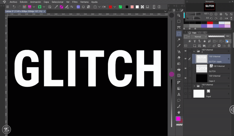 ➃ Las letras ahora huecas podemos usarlas de múltiples modos, pero en este caso las moveré por debajo de la capa base y la desplazare a un costado para darle al texto un efecto de tridimensionalidad.