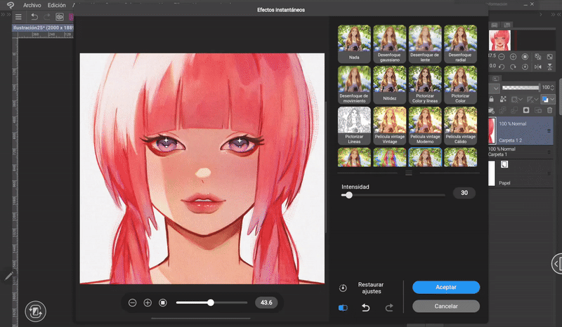 Al seleccionar la miniatura de alguno de los filtros verás como la vista previa de tu ilustración cambia de acuerdo al filtro seleccionado. Los filtros instantáneos traen ya una configuración establecida, pero puedes bajar la intensidad con la barra de porcentaje que se encuentra en la parte inferior.