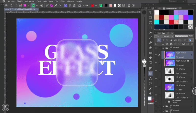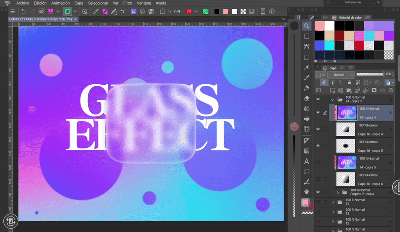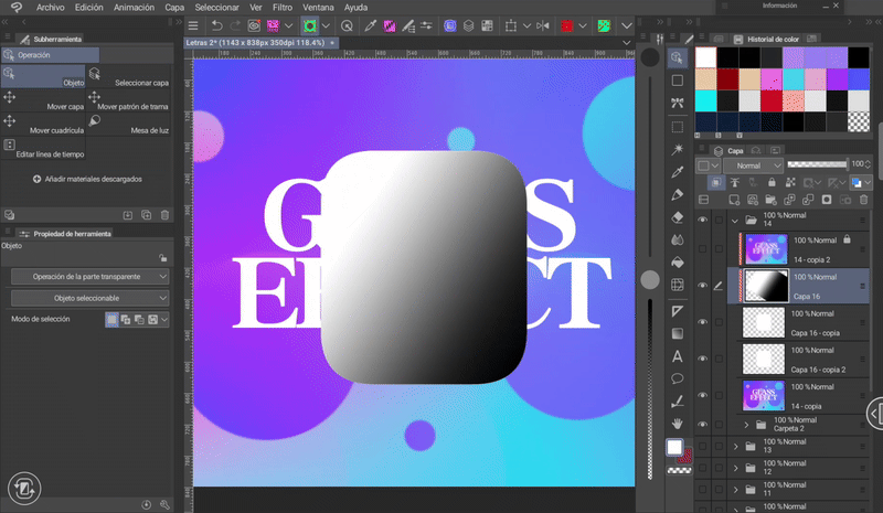 Ya tenemos nuestro efecto terminado. Si deseamos mover la figura a través del lienzo, tendremos que usar la herramienta «Operación» mientras están seleccionadas ambas capas de figuras.