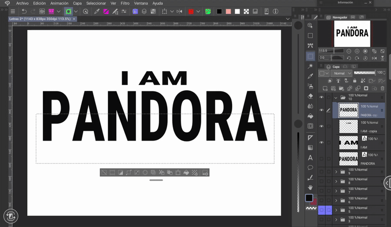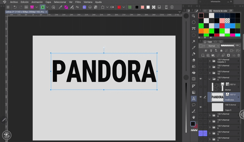 ➁ Lo segundo es usar la herramienta de «Selección» y determinar pequeñas zonas sobre las letras y después con la herramienta de «Transformar» desplazar las selecciones fuera de las letras un poco.