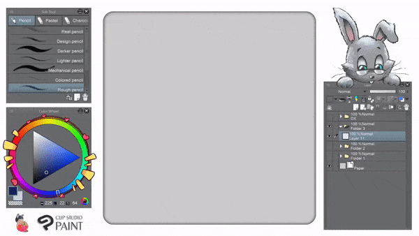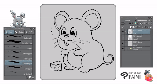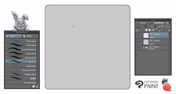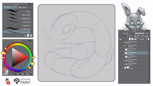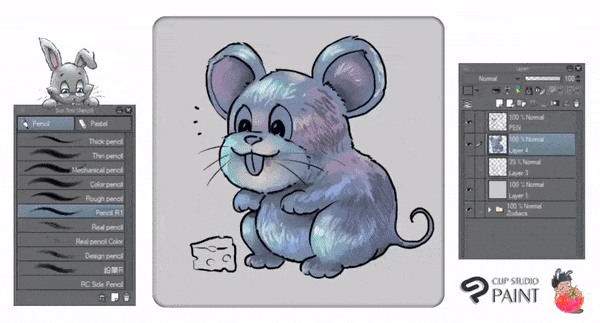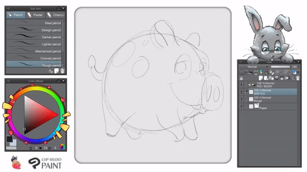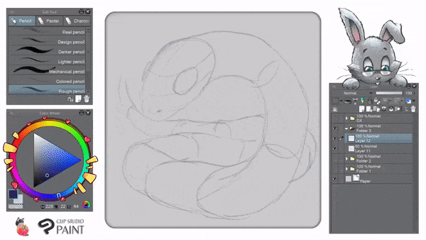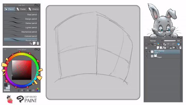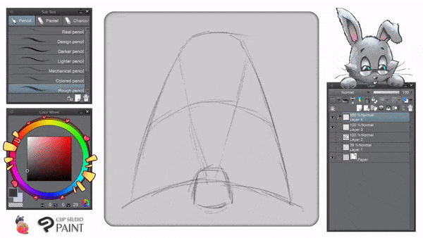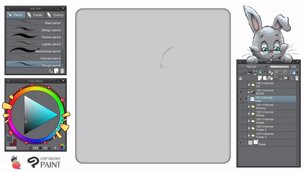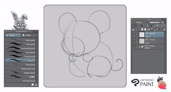 ▲ Empiezo a definir las formas estructuradas con un boceto: intento dibujar con trazos ligeros de formas simples como círculos, óvalos, y luego añado algunas características del conejo. Usando solo el 𝐋á𝐩𝐢𝐳 Á𝐬𝐩𝐞𝐫𝐨, como puedes ver en el GIF de arriba; intento no definir los detalles del pelaje del conejo, ya que sería similar a pintar el de la rata. En cambio, en este sencillo tutorial de conejos, encontrarás otros consejos además de detallar el pelaje.