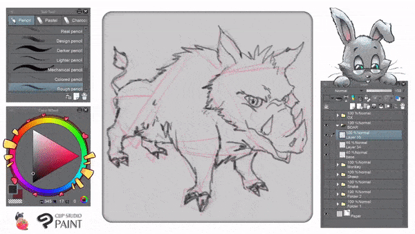 ▲ Con una nueva capa, empiezo a definir las formas estructuradas con un boceto. Usando solo el 𝐋á𝐩𝐢𝐳 Á𝐬𝐩𝐞𝐫𝐨, como puedes ver en el GIF de arriba; intento no definir los detalles del pelaje del jabalí, ya que será lo mismo que pintar el de la rata de nuestro primer capítulo.
