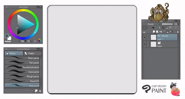▲ Comienza con 𝐟𝐨𝐫𝐦𝐚𝐬 𝐬𝐢𝐦𝐩𝐥𝐞𝐬; usando círculos para la mayoría de las líneas de dibujo (𝑐𝑢𝑟𝑣𝑎𝑠). Estoy usando 𝐏𝐞𝐧𝐜𝐢𝐥 𝐑𝟏 para crear mi boceto. ¡El dibujo a lápiz es GRATIS de nuestra gran comunidad CSP! Si no puedes conseguirlo, puedes descargar uno similar aquí:
