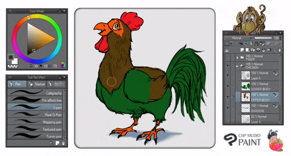 ▲ Bueno, debido a que el tiempo se agota al hacer este tutorial. Así que me salto el paso de mostrarles capas separadas para el bloqueo de color. Usando solo el 𝐏𝐥𝐮𝐦𝐚 𝐍𝐚𝐛𝐨, como pueden ver en el GIF de arriba; doy un contorno adecuado y elijo algunos colores básicos para un gallo: verde oscuro, marrón oscuro, naranja y rojo. Además, gris azulado para la sombra.
