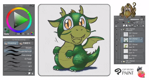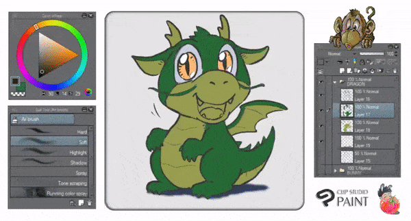 ▲ La clave para colorear a nuestro lindo dragón es entender dónde colocar las sombras y los reflejos. Obviamente, para que algo parezca en 3D, tienes que entender los conceptos básicos del coloreado (ya sea tradicional o digital). Por favor, echa un vistazo al GIF de arriba, especialmente a la pata y la cabeza de mi dragón, te muestra cómo las formas redondeadas se construyen a partir de la aplicación de colores oscuros y claros.