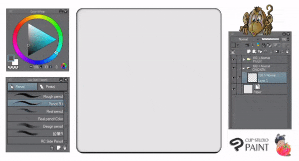 ▲ Con 𝐏𝐞𝐧𝐜𝐢𝐥 𝐑𝟏 y otra nueva capa. Defino la estructura del pollo a partir de sus formas iniciales. Después de terminar con los bocetos, añado algunas plumas en capas a nuestra ilustración de gallo para que se vea mejor que plano para la guía de color.