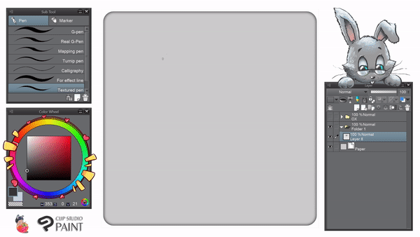 ▲ Con una nueva capa, empiezo a dar forma a mi conejo. En esta etapa, estoy usando el 𝐏𝐥𝐮𝐦𝐚 𝐂𝐨𝐧 𝐓𝐞𝐱𝐭𝐮𝐫𝐚 para darle a mi conejito un aspecto alegre y adorable. Si deseas probar con otro bolígrafo, adelante. Pero el bolígrafo texturizado, en mi opinión, es la mejor manera de lograr algunos trazos simples, ya que tiene una buena variedad de resultados de presión.