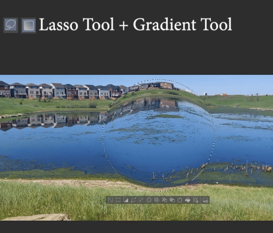 Filtro -> Distorsionar -> Lente de ojo de pez. Aquí lo estoy aplicando a una selección circular con la herramienta Lazo.