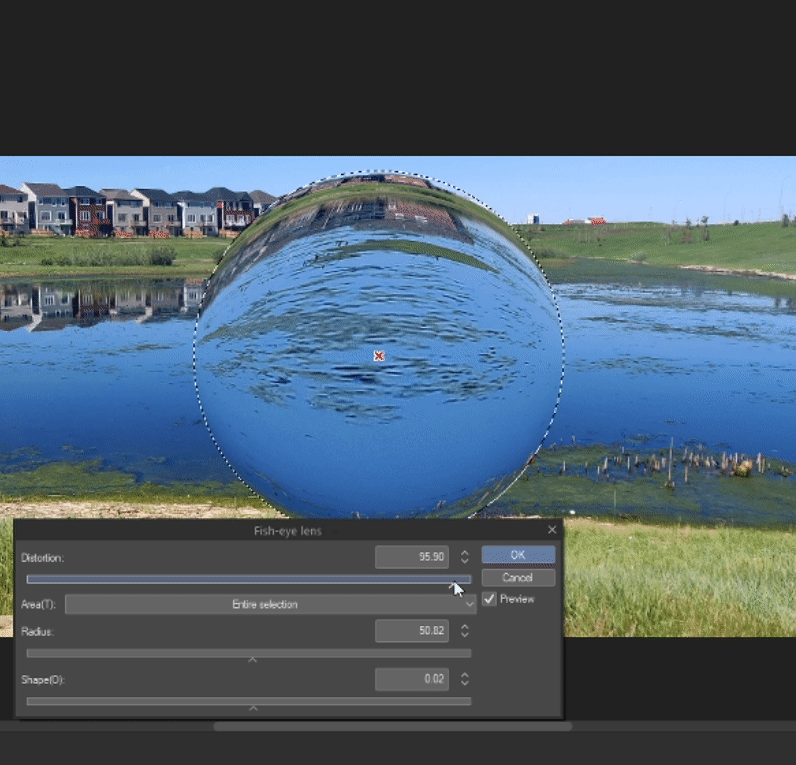 Una forma genial de conseguir el efecto de refracción es utilizar el filtro Lente de ojo de pez en Clip Studio Paint, puedes acceder a él yendo a
