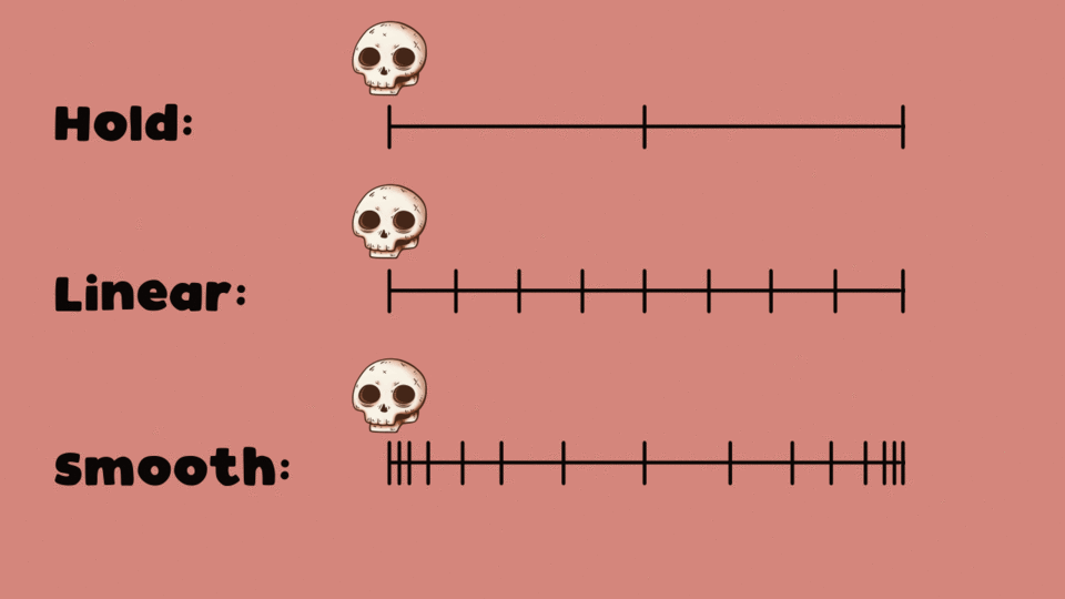 Lo primero a considerar al crear tus fotogramas clave es el tipo de interpolación que tienes habilitado entre esos fotogramas. Hay tres tipos de interpolación entre los que puedes elegir: Mantener, Lineal y Suave. Puedes cambiar rápidamente cómo se interpolan tus fotogramas clave haciendo clic derecho en el fotograma y cambiando al método deseado.