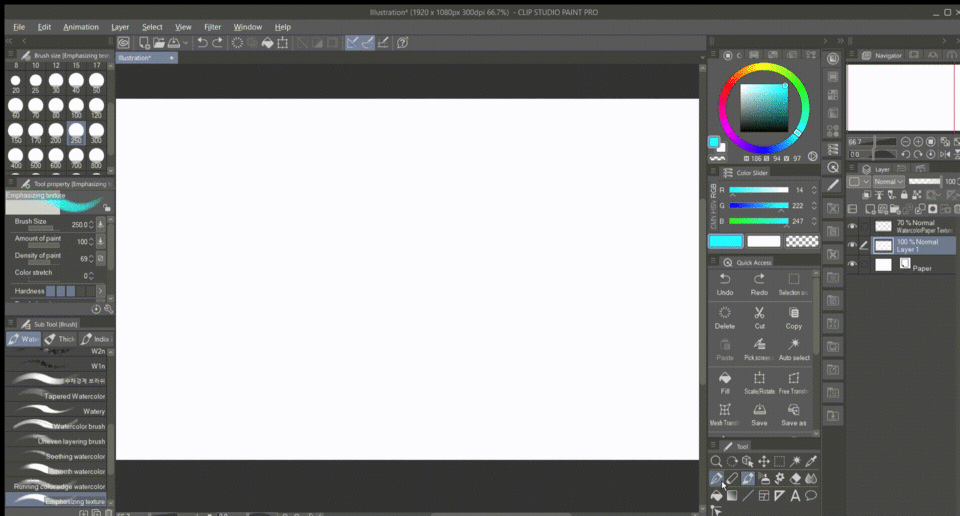 Al añadir un papel de textura y colocarlo en la parte superior de las capas, podemos tener el mismo papel de textura de acuarela que tenemos en nuestro lienzo tradicional.