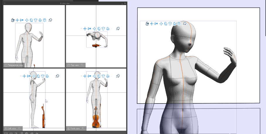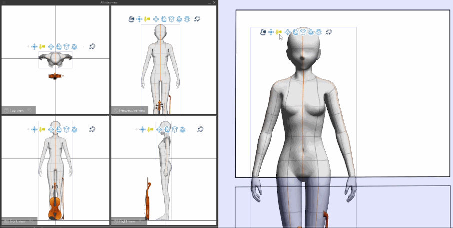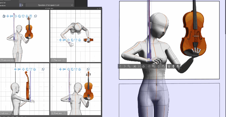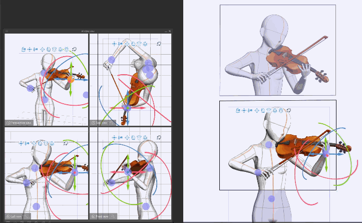 Una vez fijados los puntos de sujeción, cualquier movimiento o rotación de las manos de la figura se reflejará en el violín y el arco. Sin embargo, el violín y el arco no están en la posición correcta. Coloquemos los materiales secundarios con precisión manipulándolos simultáneamente en las cuatro ventanas gráficas.