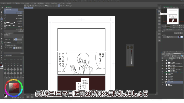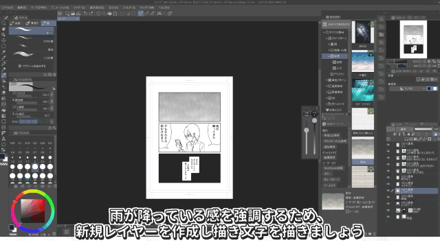 Para enfatizar la sensación de lluvia,crea una nueva capa y dibuja el texto de efecto.Selecciona [Pincel] de la paleta de herramientas ydibuja de la misma manera que con el lápiz.En analógico, para añadir un borde al texto de efecto,tendrías que delinear el contorno con blanco...¡Pero en Clip Studio Paint se hace en unos pocos clics!Selecciona [Efecto de borde] en [Efectos] de [Propiedad de capa],y haz clic en [Borde].¡Puedes crear un borde del color y grosor que quieras!