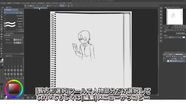 Corrige el lineart con el lápiz y el borrador.Esta vez, utilicé un lineart dibujado con un portaminas,así que hay más suciedad y líneas perdidas que en un lineart entintado,y hay muchos lugares que corregir.He dibujado los bordes de las viñetas con la herramienta [Rectángulo].¡Vamos a terminar esto!