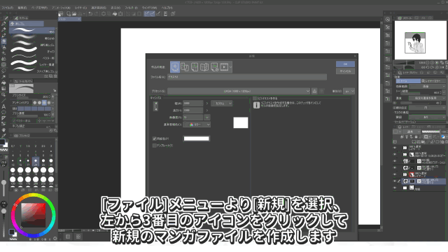 Selecciona [Nuevo] desde el menú [Archivo],haz clic en el tercer icono desde la izquierda paracrear un nuevo archivo de manga.El tamaño del manuscrito debe ajustarse a las normas del destino de la publicación si es para una revista, o a las normas de la imprenta si es para un doujinshi.En este caso, asumiremos que es para un doujinshi,y lo crearemos con un tamaño final B5 y un sangrado de 5 mm.La página de cómic se ha creado.Ahora, coloquemos los marcos de las viñetas aquí.
